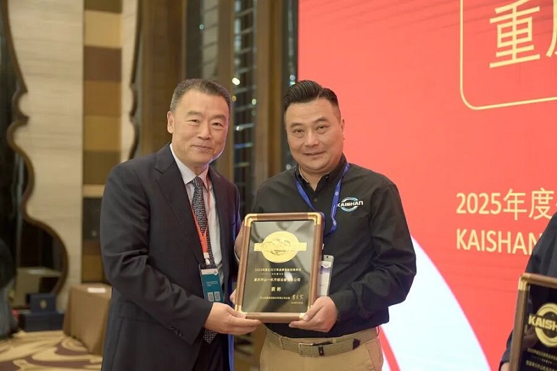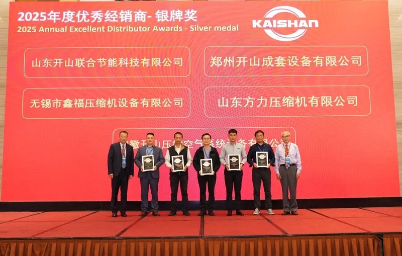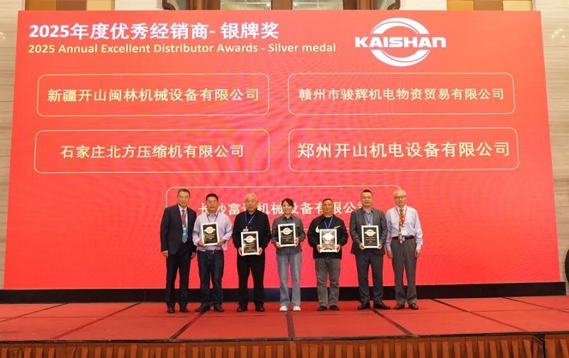 本屆大會(huì)按慣例,為34家優(yōu)秀經(jīng)銷單位頒發(fā)了獎(jiǎng)牌。與以往不同的是,其中十家經(jīng)銷單位因?yàn)檫B續(xù)五年獲評(píng)“最佳經(jīng)銷單位”,獲頒特制銀質(zhì)獎(jiǎng)?wù)隆R瞬┝﹂_山機(jī)電設(shè)備有限公司和重慶開山一機(jī)節(jié)能設(shè)備有限公司因?yàn)?025年度銷售/訂單突破億元,首次獲頒金質(zhì)獎(jiǎng)?wù)隆F渲幸瞬┝σ堰B續(xù)三年銷售過億元,主要銷售開山重工的全液壓鉆車機(jī)系列高端產(chǎn)品。重慶開山一機(jī)則銷售包括干式無油螺桿空壓機(jī)、大功率螺桿空壓機(jī)、變節(jié)距干式真空泵、離心式壓縮機(jī)等高端產(chǎn)品。公司祝賀并感謝這兩家公司在幫助開山拓展高端市場(chǎng)取得的突出成就。曹董號(hào)召全體經(jīng)銷單位以他們?yōu)榘駱樱酵懈嗟匿N售超億元經(jīng)銷單位涌現(xiàn)。